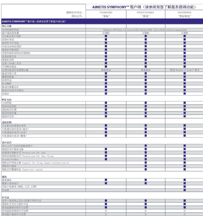 赛视达(安视)Senstar Aimetis Symphony™ Enterprise(企业版)──实现智能视频监控。企业版包括了标准版和专业版的所有功能,及多种Senstar Aimetis VE Series™视频分析算法,从而将视频应用从被动的录制设备转变为主动的企业智能采集工具。